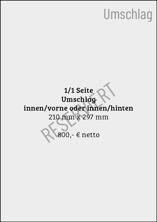 Bei Buchung in den nächsten beiden Ausgaben und bei der Buchung bis Widerruf stimmen wir vor jeder neuen Ausgabe Ihre Anzeige noch mal mit Ihnen ab. Sie haben die Möglichkeit, Ihre Anzeige zu jeder Ausgabe auch zu ändern.