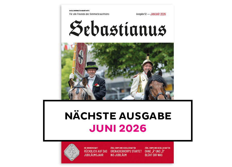Seit 1999 erscheint zweimal im Jahr das Magazin „Sebastianus“ mit Informationen aus der Bruderschaft, den Zügen, Corps und Gesellschaften und dem Königshaus.